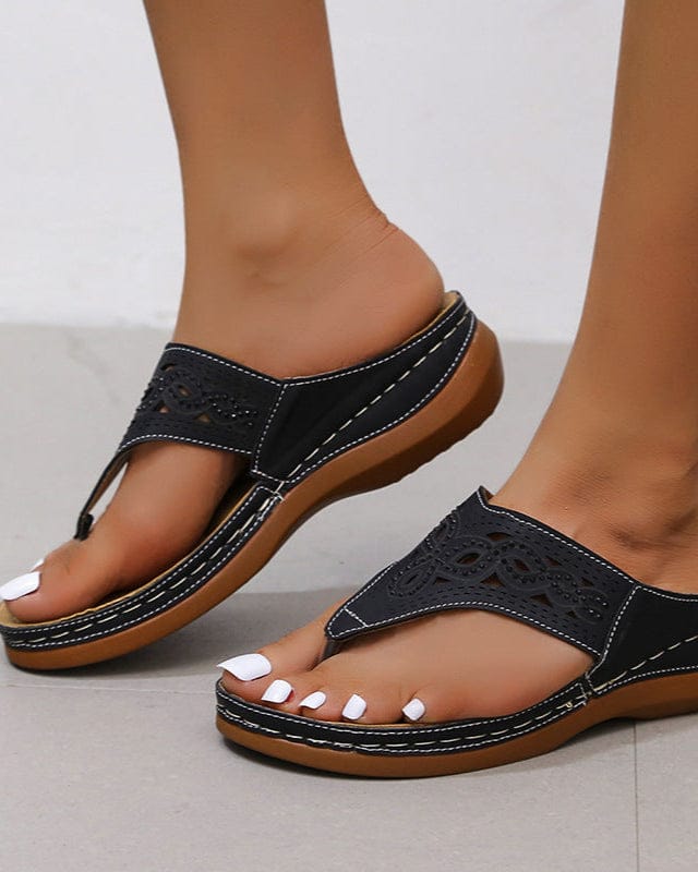 Ces tongs à plateforme pour femme se distinguent par leurs brides évidées (hollow-out) décorées de strass brillants, apportant une touche glamour et tendance. La semelle plateforme offrant une hauteur modérée assure à la fois style et confort lors de vos déplacements.