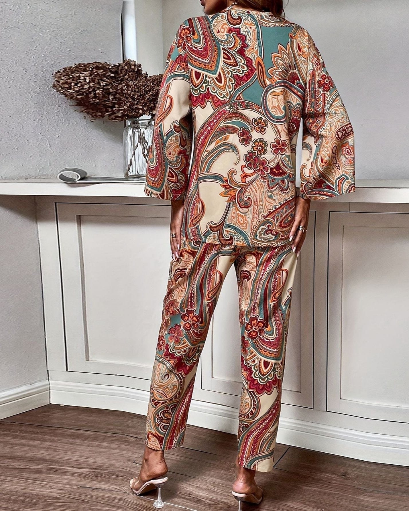 Cet ensemble pour femme présente un design rétro élégant avec des imprimés uniques qui apportent une touche classique et contemporaine.